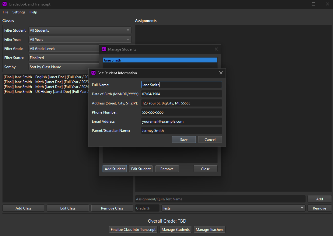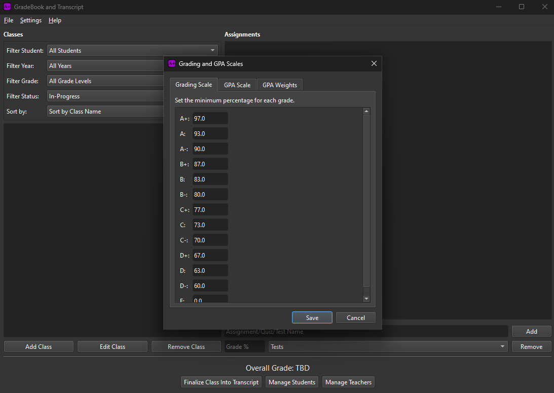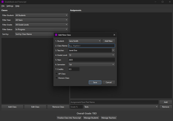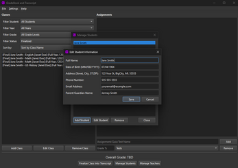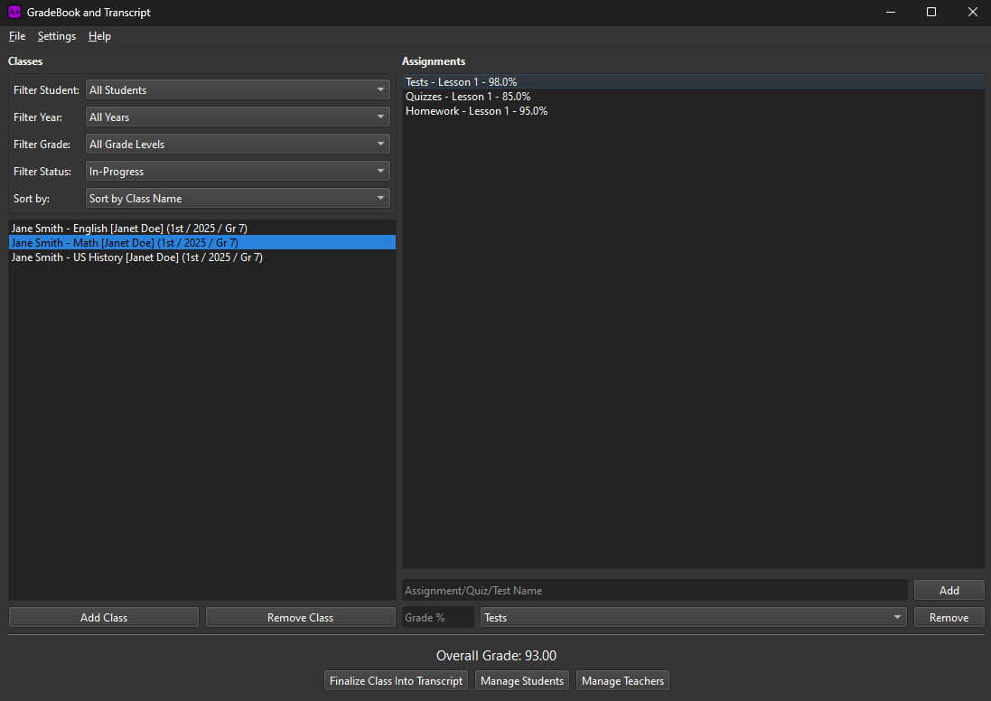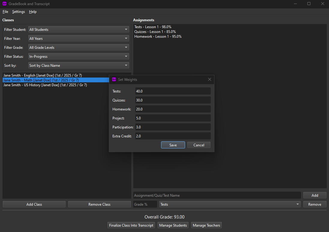 - Tracks grades for tests, homework, projects, participation, and extra credit for each class and student
