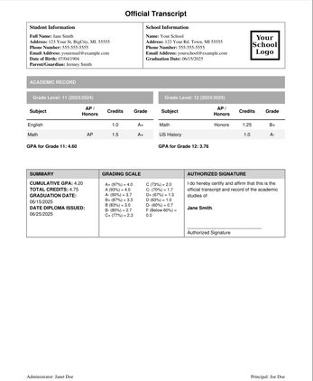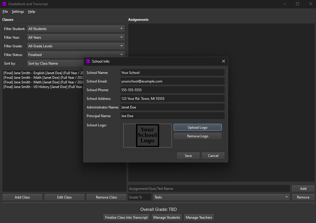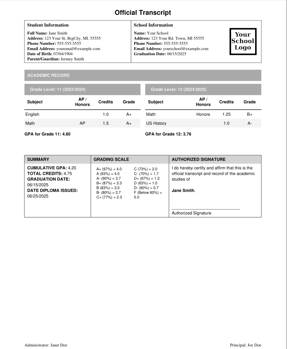 - Ability to set your school name, logo, contact information, administrator name, and principal name